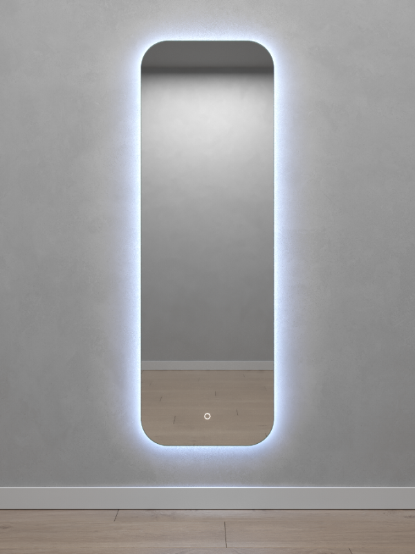 Безрамное зеркало прямоугольной формы с контурной (тыльной) холодной подсветкой, свет 6000К. Подложка из высококачественного МДФ, светодиодная лента защищена матовым свето-рассеивателем от попадания пыли и влаги. Есть вывод 220W для подключения к сети, включение подсветки от сенсорной кнопки на зеркале, её расположение на зеркале можно выбрать на заказ.